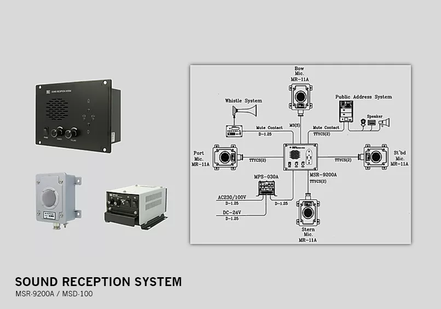 Sound Reception System is a device for the wheelhouse isolated from the outside to pick up the signals clearly coming from other vessels by sensing the sound waves (70Hz-820Hz) outside the vessel. A sound amplifier and speakers are installed in the wheelhouse, and four waterproof microphones are connected to the outside. It is possible to figure out the direction of sound as the speakers in the wheelhouse play the amplified sound from the microphones installed outside. The level of output sound can be controlled and interfaced to the PAGA and Whistle systems.-